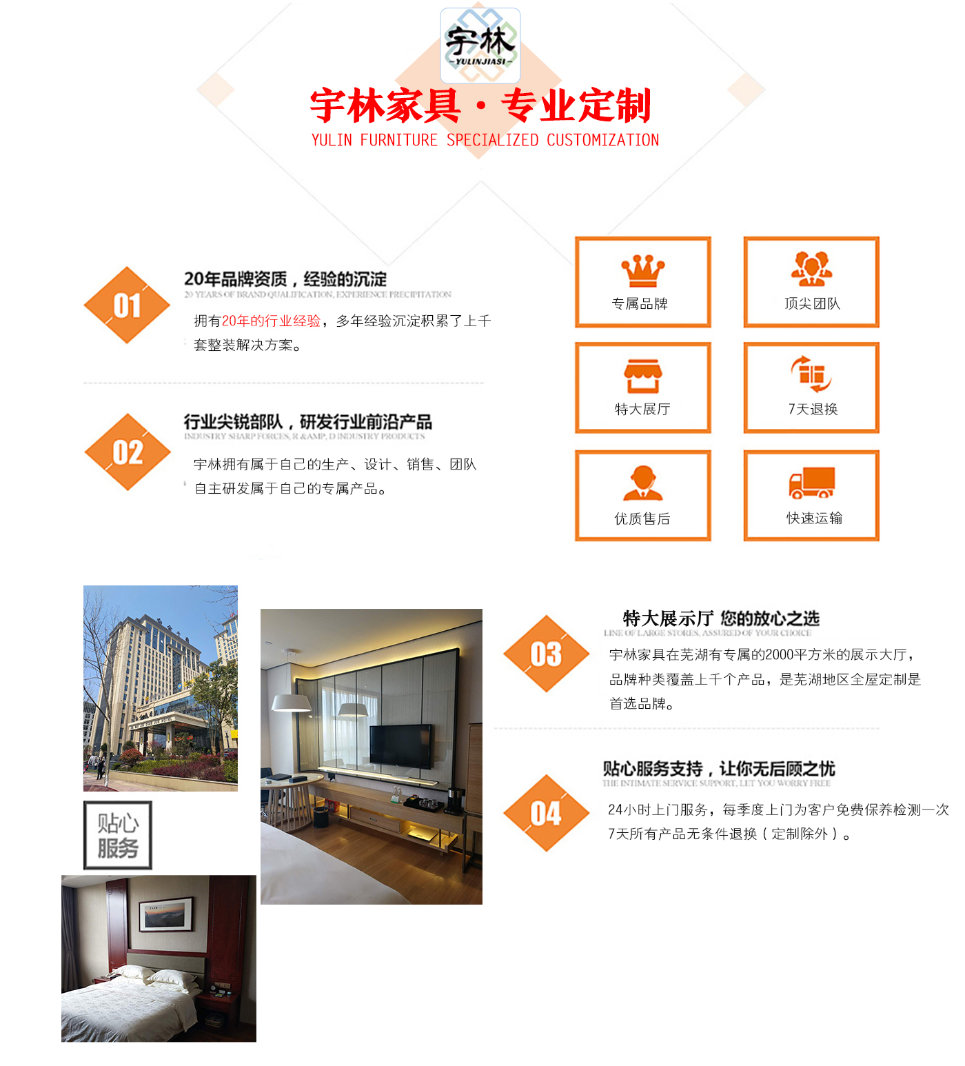 蕪湖宇林工貿(mào)有限公司創(chuàng)建于1996年,位于蕪湖高新技術(shù)開發(fā)區(qū)南區(qū),占地面積13000余平方米。是一個集研發(fā)、設(shè)計為一體的綜合性公司,公司主營整體家居定制、酒店家具定制、娛樂場所配套家具以及軟體系列,團隊,銳意革新、進(jìn)去不息的理念,逐漸成為蕪湖家具行業(yè)的生產(chǎn)廠家,并在2006年注冊了“宇林”牌商標(biāo)。宇林品牌家具依現(xiàn)代與古典相結(jié)合的多種實木家具、實木貼皮家具。家具做工精細(xì),多用人工雕刻;其自然、典雅的風(fēng)格在很大程度上引導(dǎo)著人...